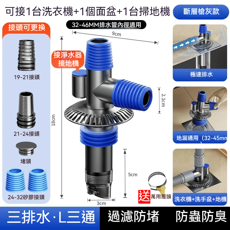 【排水系統終極方案】洗衣機專用三通地漏接頭 三向分流|真空防臭|秒速安裝